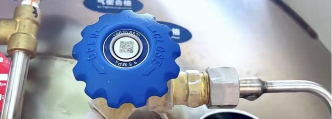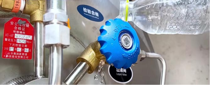 务必佩戴手套操作气瓶上的出液阀、增压阀、放空阀,避免低温冻伤。顺时针旋转为关闭阀门,逆时针旋转为开启阀门。开启阀门到最大角度时,建议回转10-20度,以避免低温结冰冻住阀芯。如果阀门被冻住,也不要用锤子和撬棍敲击,应该用温水持续浇注,融化冰霜后再对阀门进行操作。