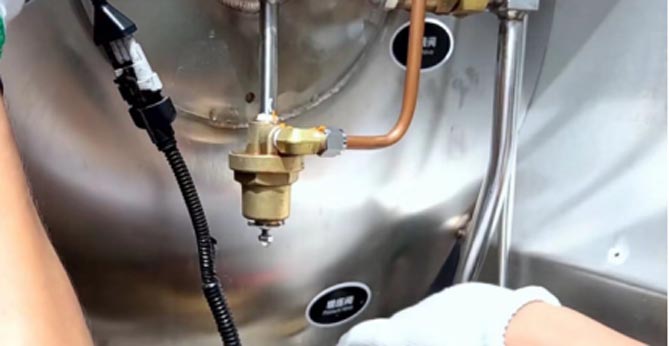 下部是经济阀,气瓶出厂时的压力已经设定好了,一般如果说气瓶的压力高于经济阀设定的范围时,经济阀自动开启。此时,气瓶内上部的气体会经过经济阀,进入到出液阀的管路,供发动机所用,同时气瓶的压力得到及时降低。当气瓶的压力低于经济阀设定的范围值时,经济阀自动关闭,此时气瓶内的液化天然气经过出液阀继续给发动机供气。