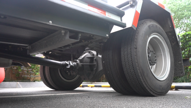 该车型的最大亮点在于其“可下地库”与“双胎”设计。凭借仅2100mm的外部高度,它可以轻松进入绝大多数标准限高的地下停车场,解决了装修垃圾清运“最后一公里”的难题。动力上,搭载云内160马力发动机与最大27.64kW·h电池,配合带爬坡档的6档自动变速箱,确保在纯电模式下安静进出小区,在混动模式下又能轻松应对满载爬坡。3360mm短轴距保证了灵活性,而1093铸造桥(6.833速比)和高强度车架提供了强大的承载基础,使其成为名副其实的地库清运多能手。