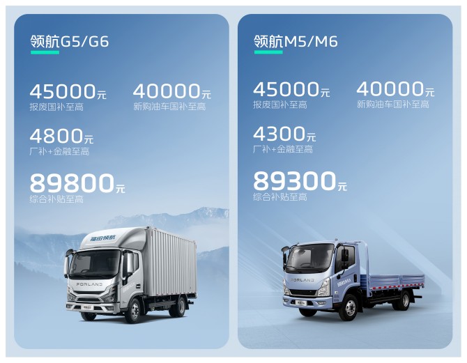 领航系列补贴方案诚意满满,领航G5、G6车型,报废国补至高45000元,新购油车国补至高40000元,厂补+金融至高4800元,综合补贴89800元;领航M5、M6车型,报废国补至高45000元,新购油车国补至高40000元,厂补+金融至高4300元,综合补贴89300元。补贴与福利叠加,进一步降低用户购车成本。