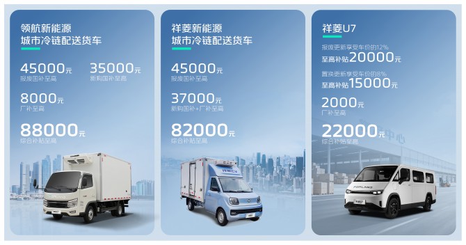 新能源系列补贴精准落地,领航新能源城市冷链配送货车,报废国补至高45000元,新购国补至高35000元,厂补至高8000元,综合补贴至高88000元;祥菱新能源城市冷链配送货车,报废国补至高45000元,新购国补+厂补至高37000元,综合补贴至高82000元;祥菱U7,报废更新至高享受车价的12%(至高补贴2万元),置换更新享受车价的8%(至高1.5万元),厂补至高2000元,综合补贴至高22000元,全面满足不同新能源用户的焕新需求。