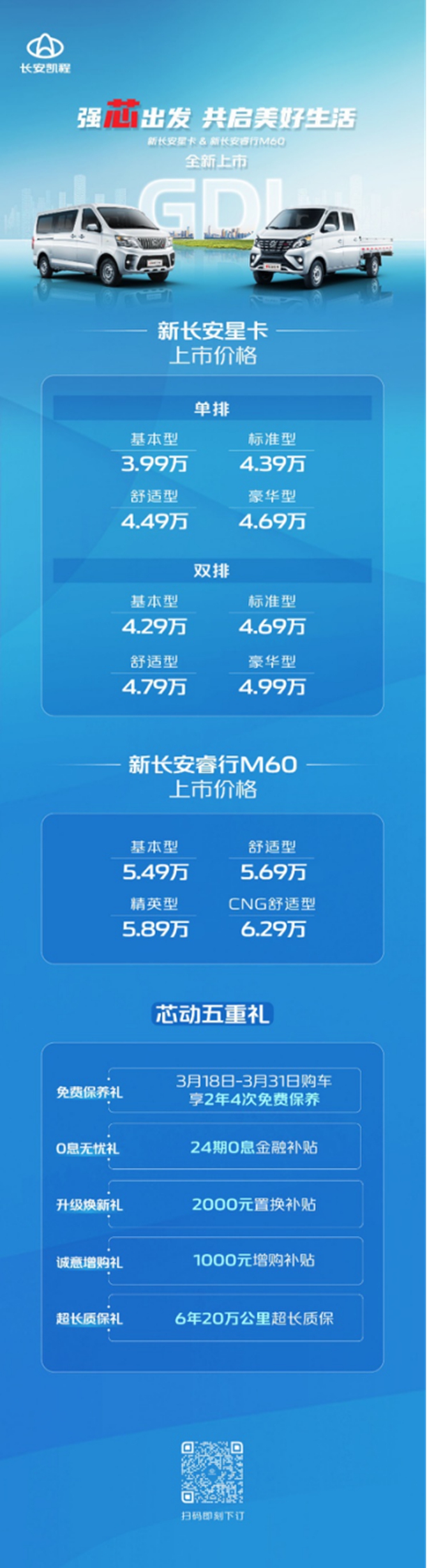 为了感谢广大新老用户,长安凯程针对两款新车推出“芯”动五重礼,具体包括:
