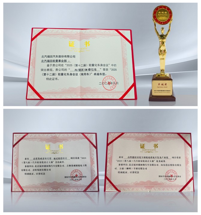 近日,欧曼银河5M 6×4牵引车在 “2025(第十二届)轻量化车身会议(商用车)” 中斩获最高奖项—— 卓越车型奖。与此同时,其 “高度集成悬架托臂一体式铸造桥壳项目” 与 “高性能轻量化车桥轮端系统开发及产业化项目”,在“2025(第八届)汽车轻量化设计大赛”中分别荣获杰出成果与优秀成果奖。这一系列荣誉不仅是行业对欧曼研发能力的高度认可,更标志着其轻量化技术已迈入系统化、平台化的成熟阶段,为商用车高效运输注入新动能。