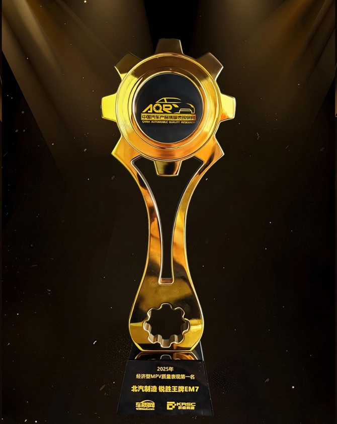 9月25日,在车质网与凯睿赛驰咨询联合主办的“2025年中国汽车产品质量表现研究(AQR)结果发布暨颁奖典礼”上,北汽制造锐胜王牌E-M7凭借出色的产品质量和用户口碑,一举夺得2025年经济型MPV质量表现第一名的桂冠。这一荣誉不仅是对北汽制造产品品质的认可,更是对其始终坚持“质量本位”理念的最好印证。